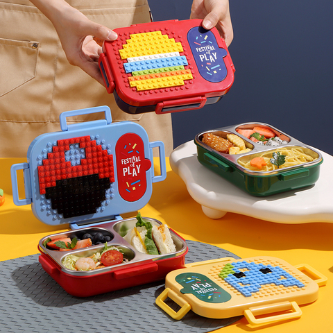 Oem ODM độc lập niêm phong thép không gỉ đồ chơi gạch 600ml Ăn Trưa Bento hộp 3 lưới PP gấp súp muỗng nĩa cho các trường học trẻ em